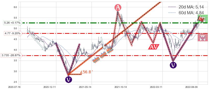 ♘ 阻力价格位5.26,可信任强度79.56%,距离最后交易2022-08-12形成的收盘价格5.25相差 +0.17%
