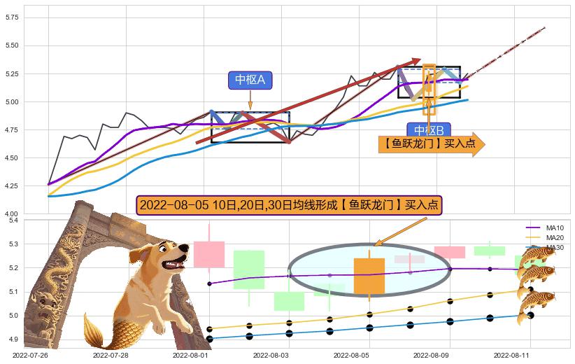 ➢ 【中枢B】:2022-08-01-2022-08-11,中枢由4笔构成,共9交易日, ZG=5.29, ZD=5.17