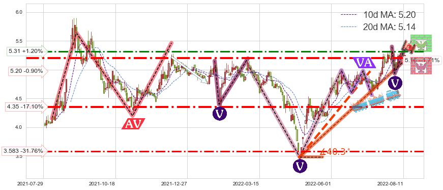 ♘ 阻力价格位5.31,可信任强度69.53%,距离最后交易2022-08-12形成的收盘价格5.25相差 +1.20%
