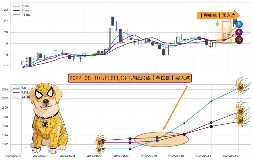 ⚀ 2022-08-10日显现 5日-8日-13日均线 【金蜘蛛】买入点 看多信号,后市看涨,买入