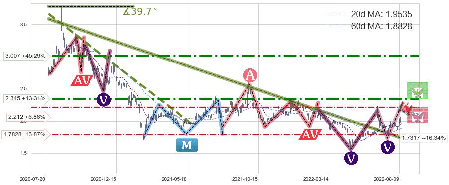♘ 阻力价格位2.345,可信任强度75.43%,距离最后交易2022-08-12形成的收盘价格2.070相差 +13.31%