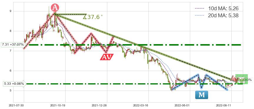 ♘ 阻力价格位7.31,可信任强度93.23%,距离最后交易2022-08-12形成的收盘价格5.33相差 +37.07%