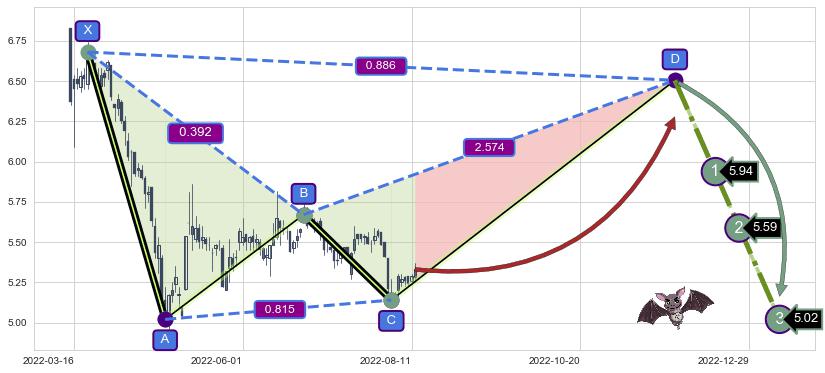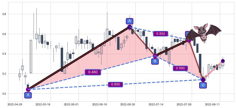 ➣ 已完成【蝙蝠】形态起点X: 2022-05-06, 终点D: 2022-08-03, 共63交易日