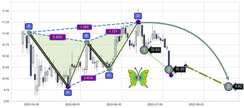 ➣ 已完成【蝴蝶】形态起点X: 2022-04-22, 终点D: 2022-07-12, 共54交易日