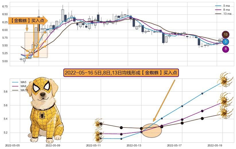 形态多维评估: ⚀ 2022-05-16日显现 5日-8日-13日均线 【金蜘蛛】买入点 看多信号,后市看涨,买入