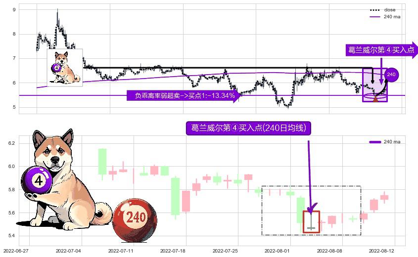 形态多维评估: ⚀ 2022-08-03-日显现 葛兰威尔均线 240日均线 第④买入点 下降趋势均值回复的短线反弹信号,后市看涨,买进信号