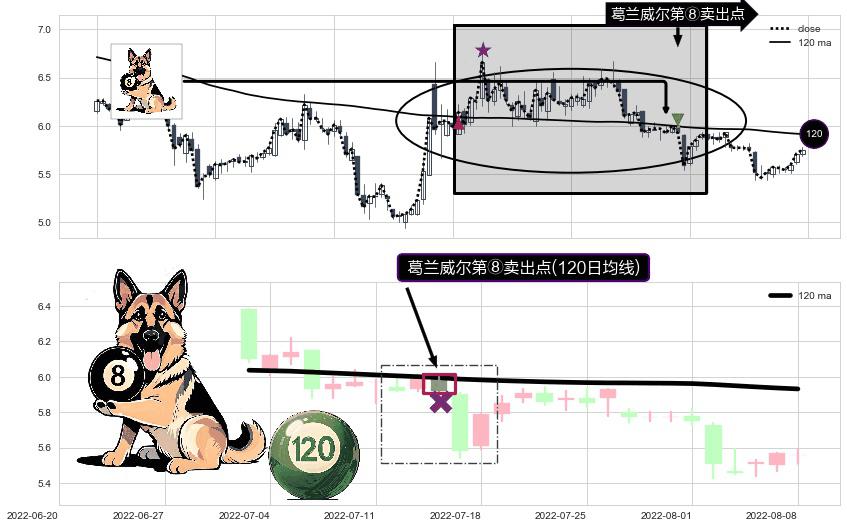 形态多维评估: ⚀ 2022-07-14-日显现 葛兰威尔均线 120日均线 第⑧卖出点 下降趋势的中继信号,后市看跌,卖出信号