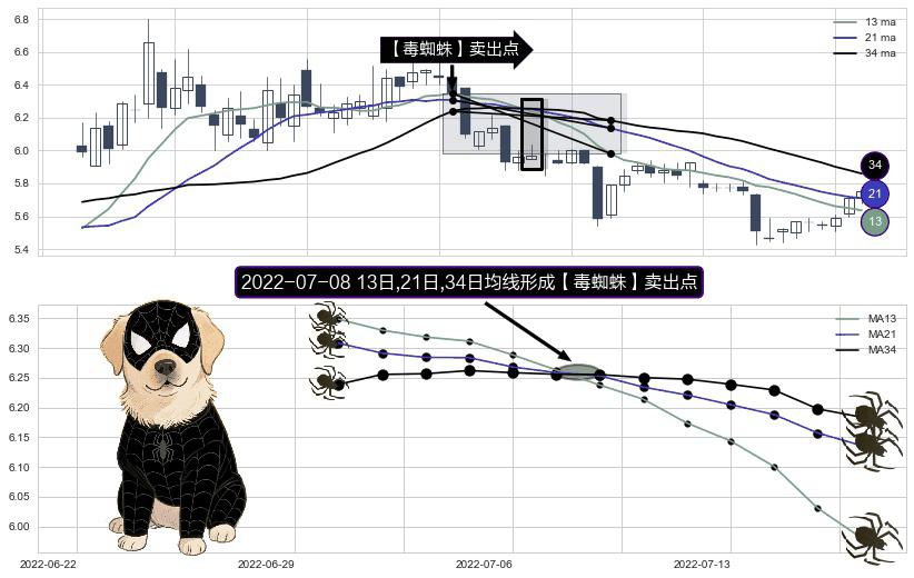 形态多维评估: ⚀ 2022-07-08日显现 13日-21日-34日均线 【毒蜘蛛】卖出点 看空信号,后市看跌,卖出