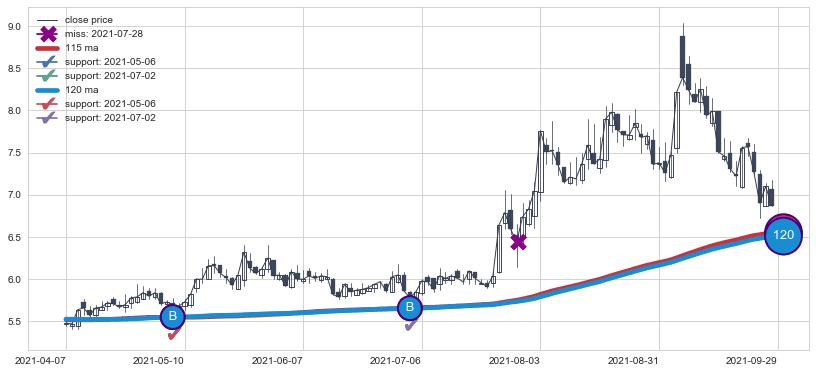 上涨趋势2021-04-07-2021-09-29,均线120, 115确认关键支撑2处