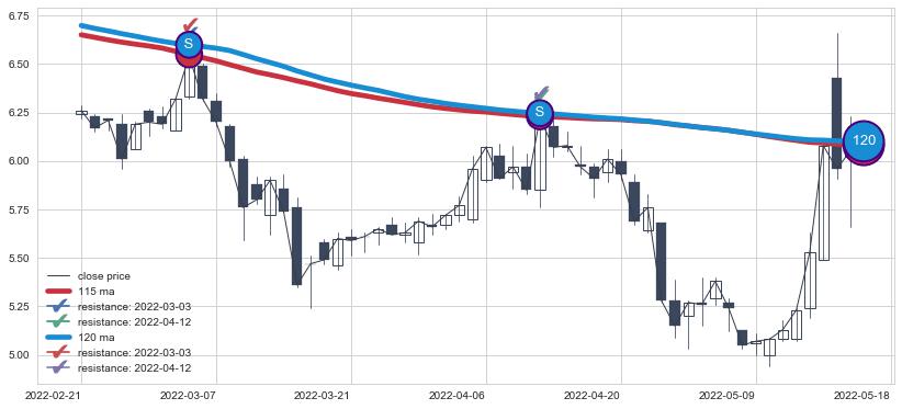 下跌趋势2022-02-21-2022-05-18,均线120, 115确认关键阻力2处