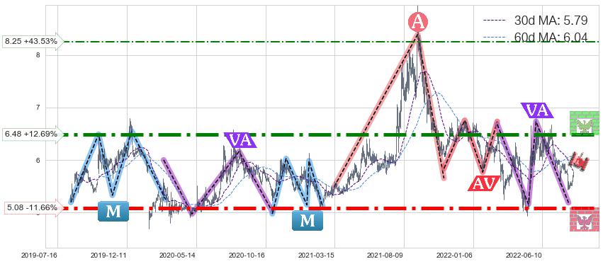 ♘ 阻力价格位8.25,可信任强度54.71%,距离最后交易2022-08-12形成的收盘价格5.75相差 +43.53%