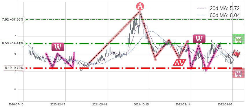 ♘ 支撑价格位5.19,可信任强度95.97%,距离最后交易2022-08-12形成的收盘价格5.75相差 -9.79%