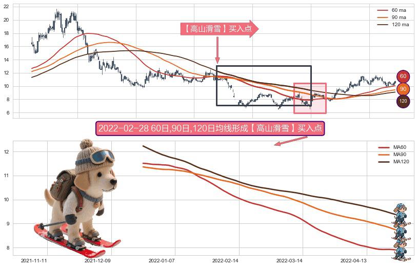 形态多维评估: ⚀ 2021-12-23日-2022-04-27日显现 60日-90日-120日均线 【高山滑雪】买入点 看多信号,后市看涨,买入
