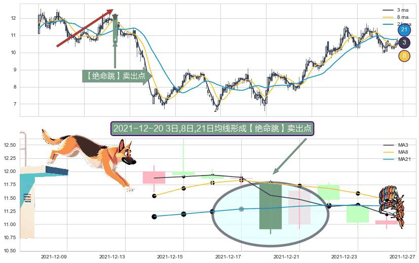 形态多维评估: ⚀ 2021-12-20日显现 3日-8日-21日均线 【绝命跳】卖出点 看空信号,后市看跌,卖出