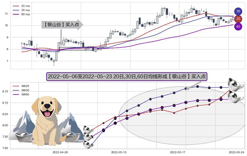 形态多维评估: ⚀ 2022-05-09-日至2022-05-23-日显现 20日-30日-60日均线 【银山谷】买入点 看多信号,后市看涨,买入