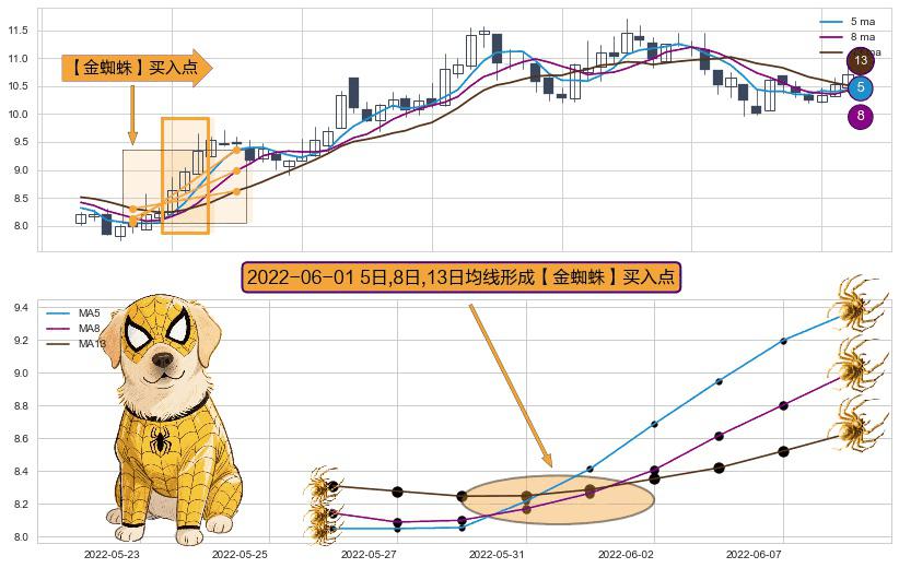 形态多维评估: ⚀ 2022-06-01日显现 5日-8日-13日均线 【金蜘蛛】买入点 看多信号,后市看涨,买入