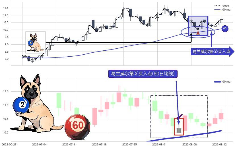 形态多维评估: ⚀ 2022-08-03-日显现 葛兰威尔均线 60日均线 第②买入点 上升趋势的中继信号,后市看涨,买进信号