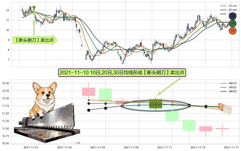 形态多维评估: ⚀ 2021-11-10日显现 10日-20日-30日均线 【断头铡刀】卖出点 看空信号,后市看跌,卖出