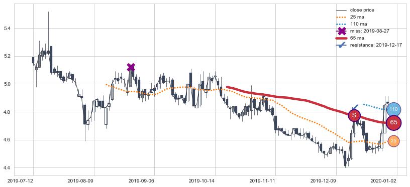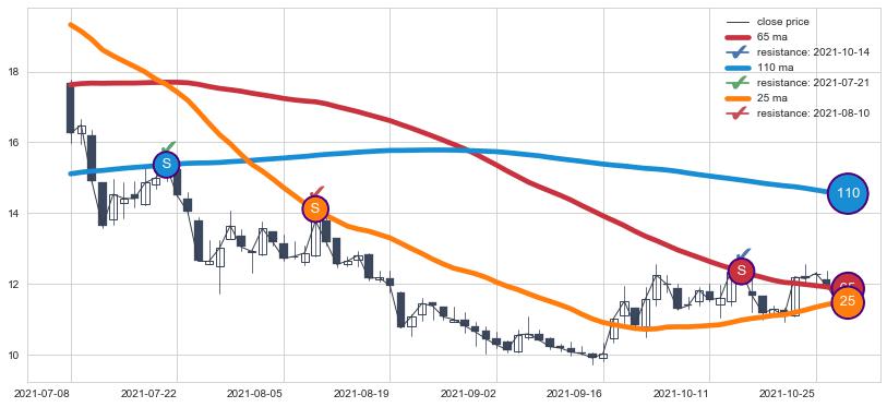 下跌趋势2021-07-08-2021-10-27,均线65, 110, 25确认关键阻力3处