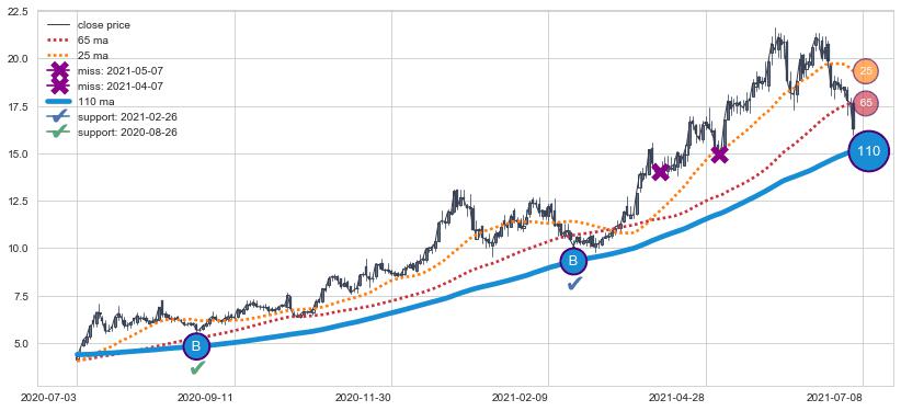 上涨趋势2020-07-03-2021-07-08,均线110确认关键支撑2处