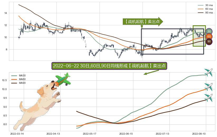 形态多维评估: ⚀ 2022-04-27日-2022-08-10日显现 30日-60日-90日均线 【战机起航】卖出点 看空信号,后市看跌,卖出