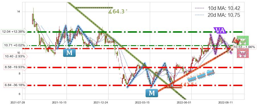 ♘ 阻力价格位10.71,可信任强度67.04%,距离最后交易2022-08-12形成的收盘价格10.71相差 +0.02%