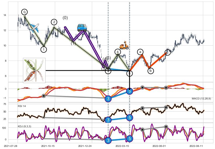 ➣ 1,3,5驱动浪MACD, RSI, KDJ走势都出现【常规背离】反转信号增强