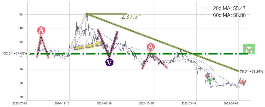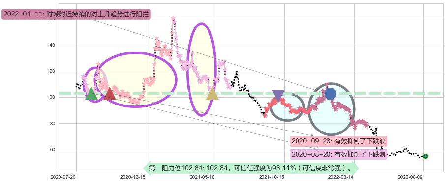 ♘ 阻力价格位102.84,可信任强度93.11%,距离最后交易2022-08-12形成的收盘价格54.97相差 +87.09%