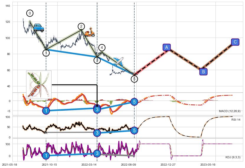 ➣ 1,3,5驱动浪MACD, RSI, KDJ走势都出现【常规背离】反转信号增强