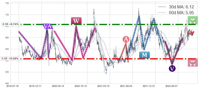 ♘ 阻力价格位6.58,可信任强度93.79%,距离最后交易2022-08-12形成的收盘价格6.05相差 +8.74%