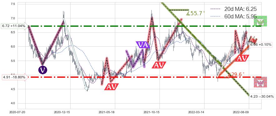 ♘ 阻力价格位6.72,可信任强度77.31%,距离最后交易2022-08-12形成的收盘价格6.05相差 +11.04%