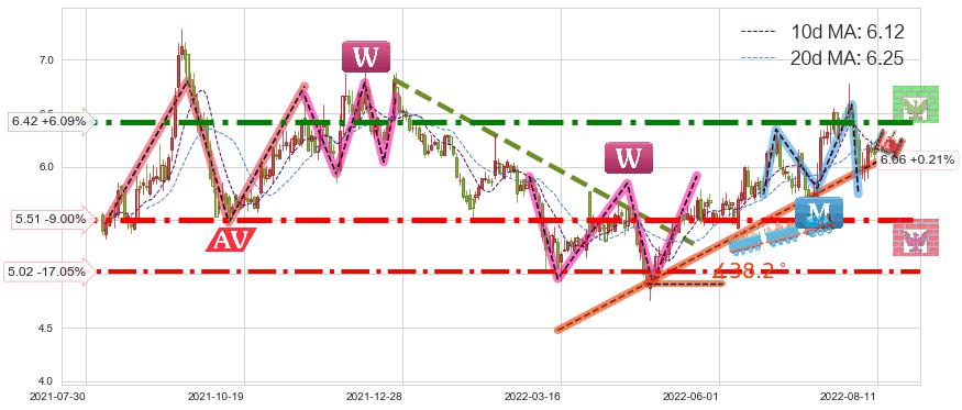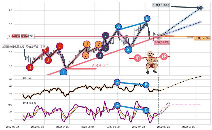 ♘ 阻力价格位6.42,可信任强度93.70%,距离最后交易2022-08-12形成的收盘价格6.05相差 +6.09%