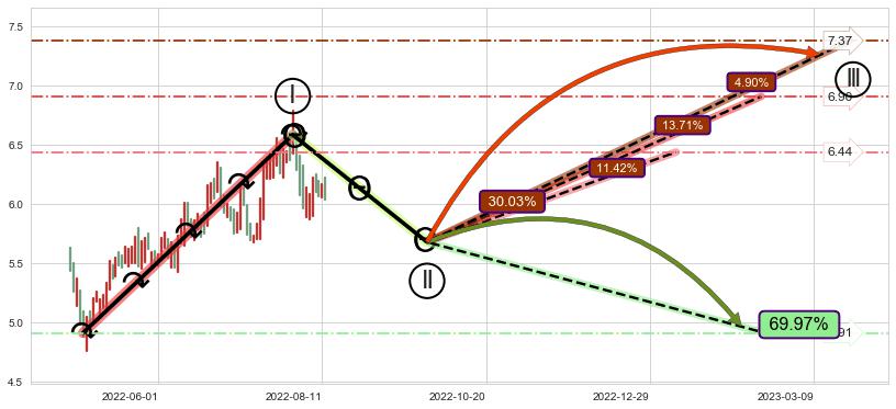 ➣ 循环浪继续向上【平均值】位置(2023-02-15, 6.90),匹配聚类样本比例45.66%, 可能性概率13.71%
