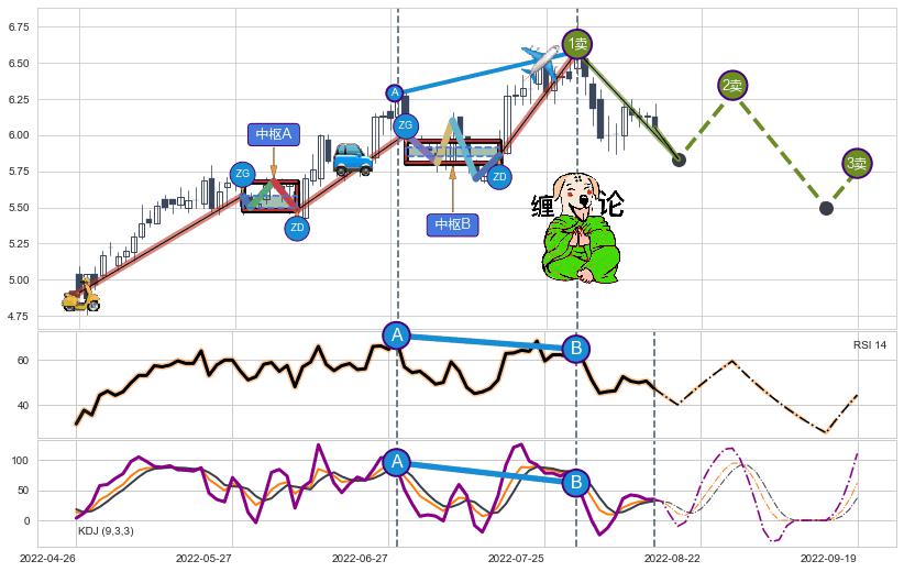 ➣ 【中枢B】:2022-06-29-2022-07-15,中枢由5笔构成,共13交易日, ZG=5.86, ZD=5.81