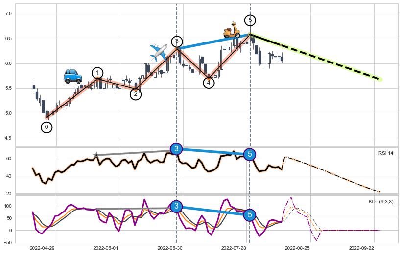 | 3 🅚:【战机起航】卖出点 ➕ 🌊:波浪理论猜想上涨浪5已形成,猜想后续形成回调abc下跌(均值回复) ☞ 看空信号 ⇥ 【均线】交织【图形】⇥ 综合量化分数: 48 | > |