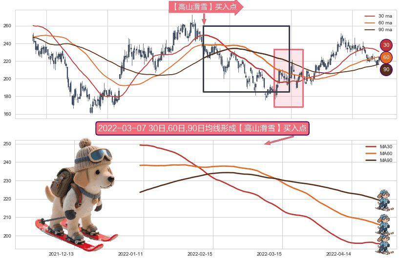 ⚀ 2022-01-10日-2022-04-26日显现 30日-60日-90日均线 【高山滑雪】买入点 看多信号,后市看涨,买入