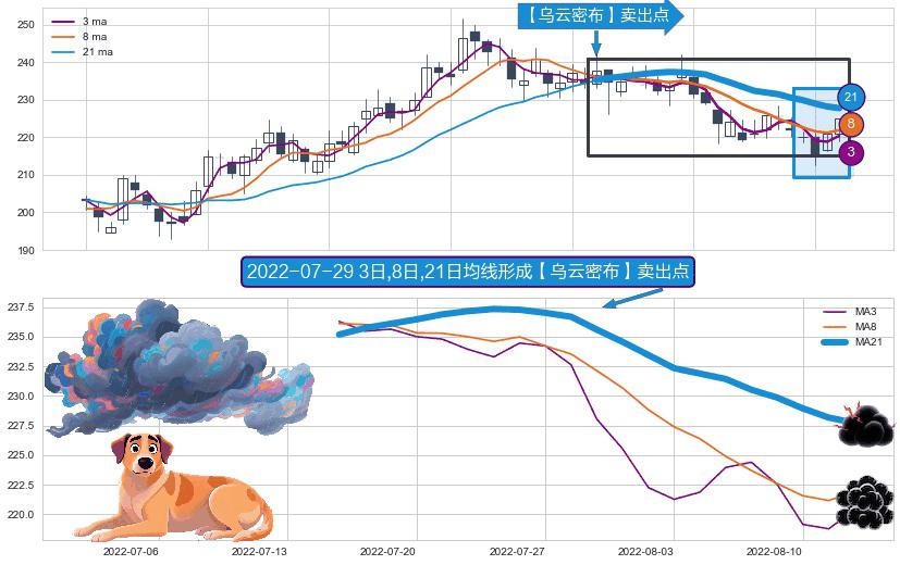 ⚀ 2022-07-15日-2022-08-12日显现 3日-8日-21日均线 【乌云密布】卖出点 看空信号,后市看跌,卖出