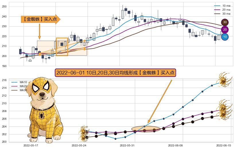 ⚀ 2022-06-01日显现 10日-20日-30日均线 【金蜘蛛】买入点 看多信号,后市看涨,买入