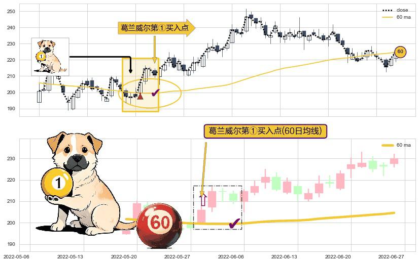 ⚀ 2022-05-30-日显现 葛兰威尔均线 60日均线 第买①入点 走势反转见底信号,后市看涨,买进信号