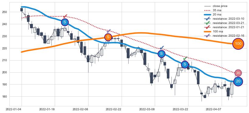 ➢ 最优均线组合共正确确认支撑阻力信号9处,正确确认率 64.29%
