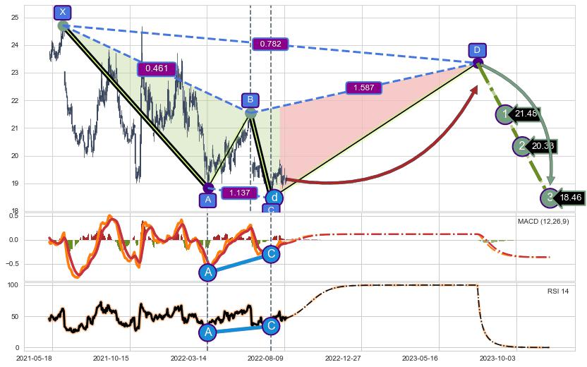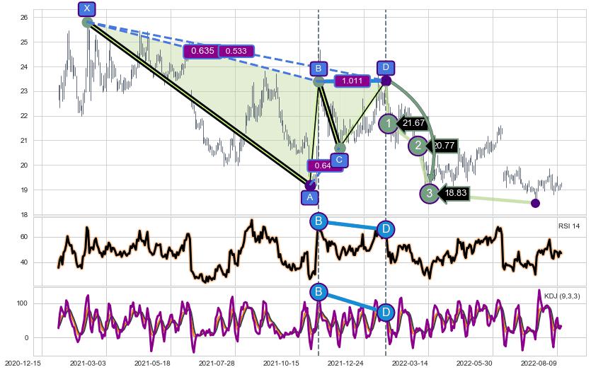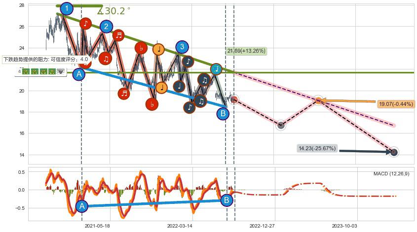➣ D点拟合预测价格23.35,距离最后交易收盘价格19.15相差 +21.92%