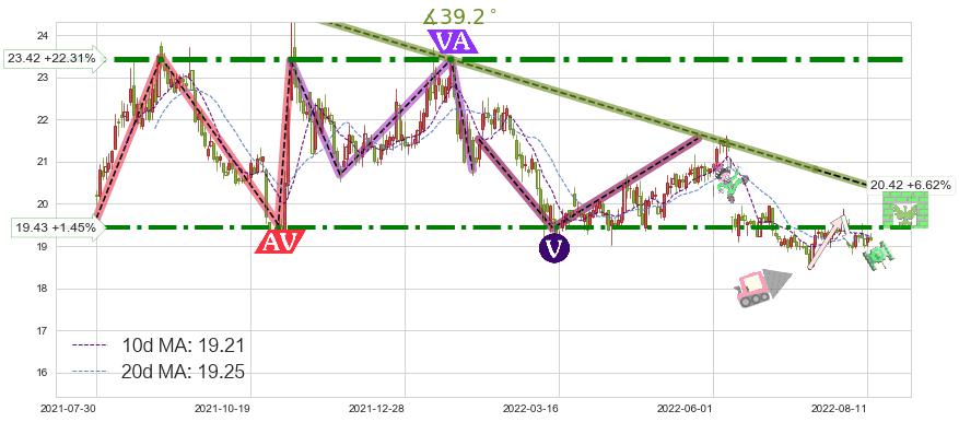 ♘ 阻力价格位19.43,可信任强度80.10%,距离最后交易2022-08-12形成的收盘价格19.15相差 +1.45%