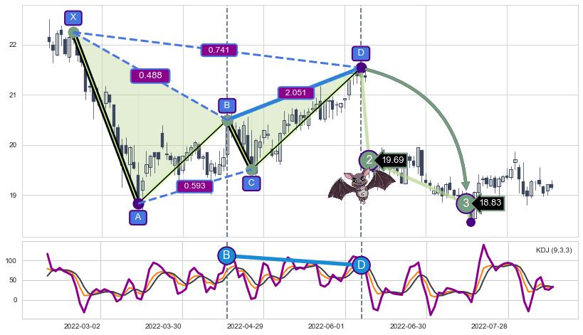 ➣ 已完成【蝙蝠】形态起点X: 2022-02-21, 终点D: 2022-06-08, 共72交易日