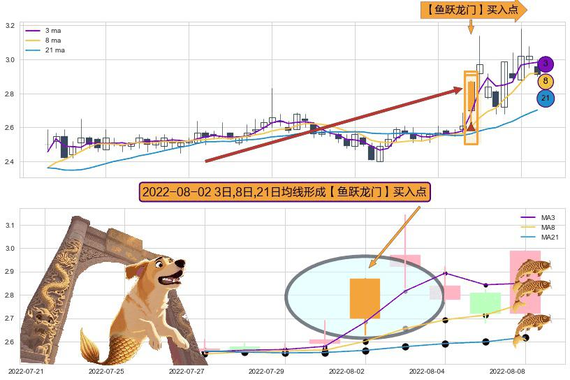 形态多维评估: ⚀ 2022-08-02日显现 3日-8日-21日均线 【鱼跃龙门】买入点 看多信号,后市看涨,买入