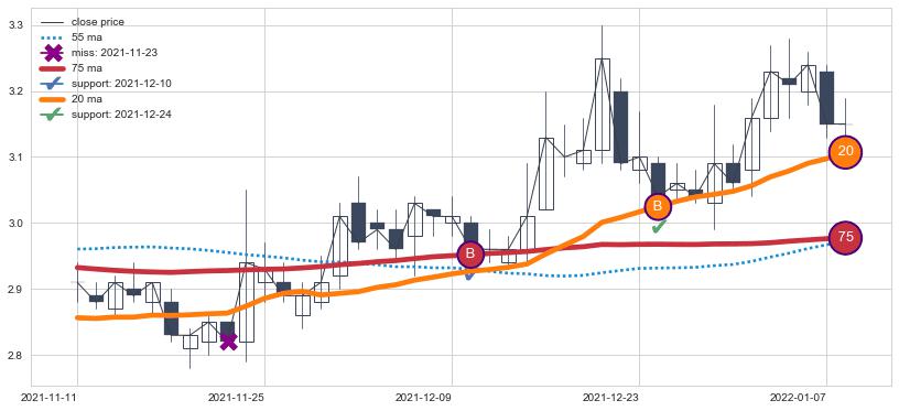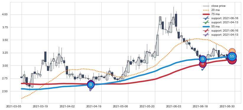 上涨趋势2021-03-05-2021-06-30,均线75, 55确认关键支撑2处
