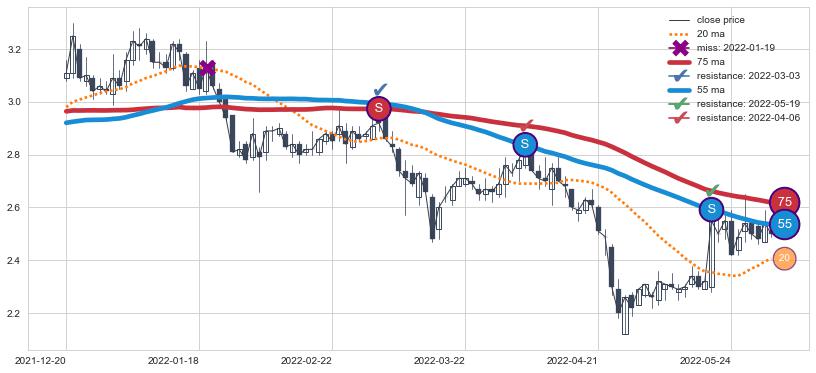 下跌趋势2021-12-20-2022-06-01,均线75, 55确认关键阻力3处
