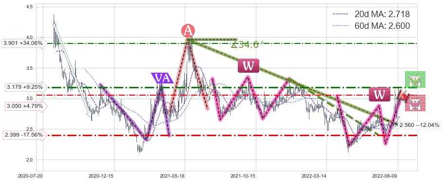 ♘ 阻力价格位3.179,可信任强度68.69%,距离最后交易2022-08-12形成的收盘价格2.910相差 +9.25%