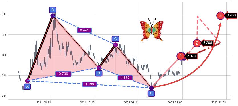 ➣ 已完成【蝴蝶】形态起点X: 2021-02-25, 终点D: 2022-04-26, 共284交易日