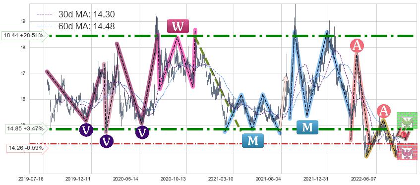 ♘ 支撑价格位14.26,可信任强度54.44%,距离最后交易2022-08-12形成的收盘价格14.35相差 -0.59%