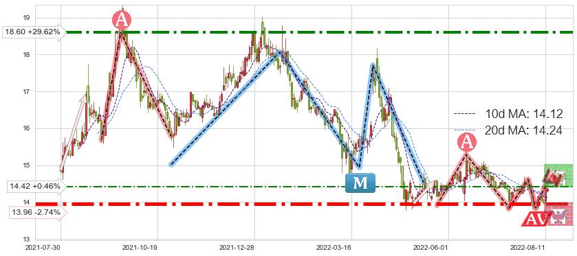 ♘ 阻力价格位14.42,可信任强度51.32%,距离最后交易2022-08-12形成的收盘价格14.35相差 +0.46%